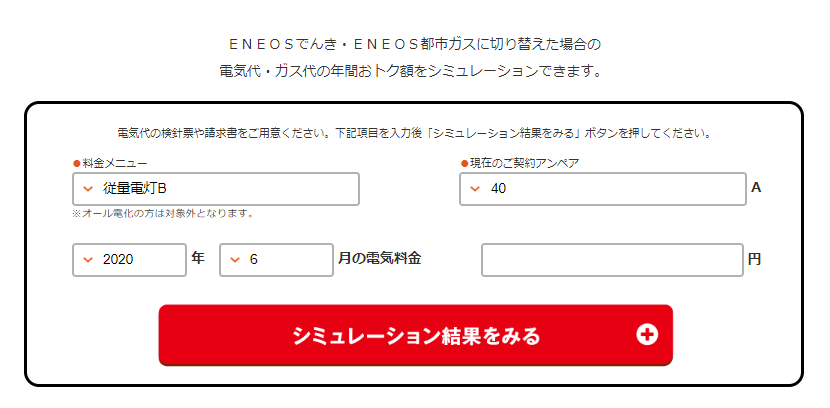 料金シュミレーションは、あなたの自宅の電気代と、ENEOS電気の電気代を比較できるものです。